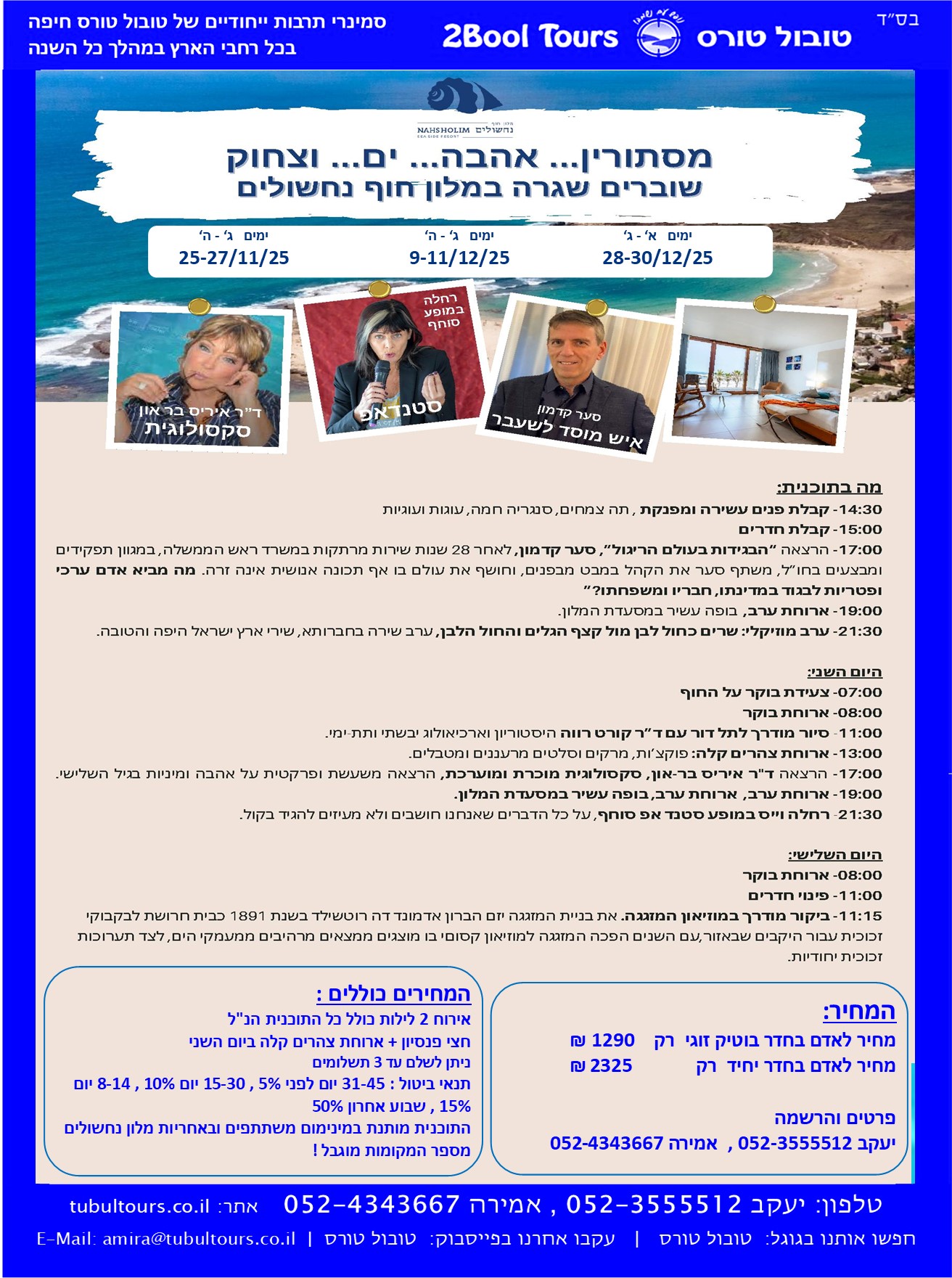 לפרטיםתמונות וחוויות מסמינר תרבות במלון חוף נחשולים 2025