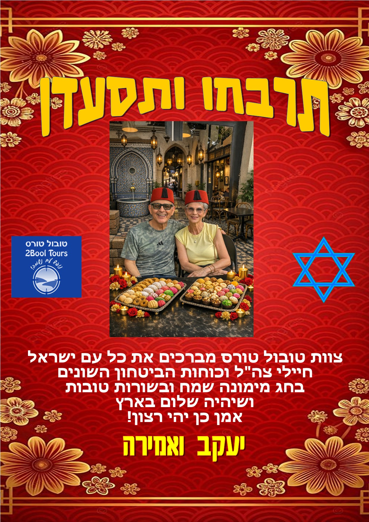 לכל לקוחותינו, כוחות הביטחון השונים צוות טובול טורס מאחלים לכם מימונה שמח וטעים, אנו מאחלים לכל אחת ואחד מכם חירות אישית, שתאפשר לכם להגשים שאיפות....