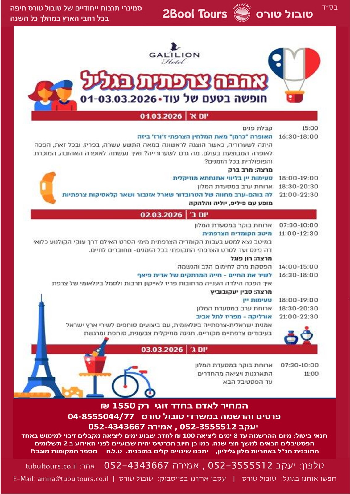 דף הבית » מוצרים » דילים ונופש- קיץ 2026 » אהבה צרפתית בגליל – במלון גליליון 8-10/2/26 1-3/3/26